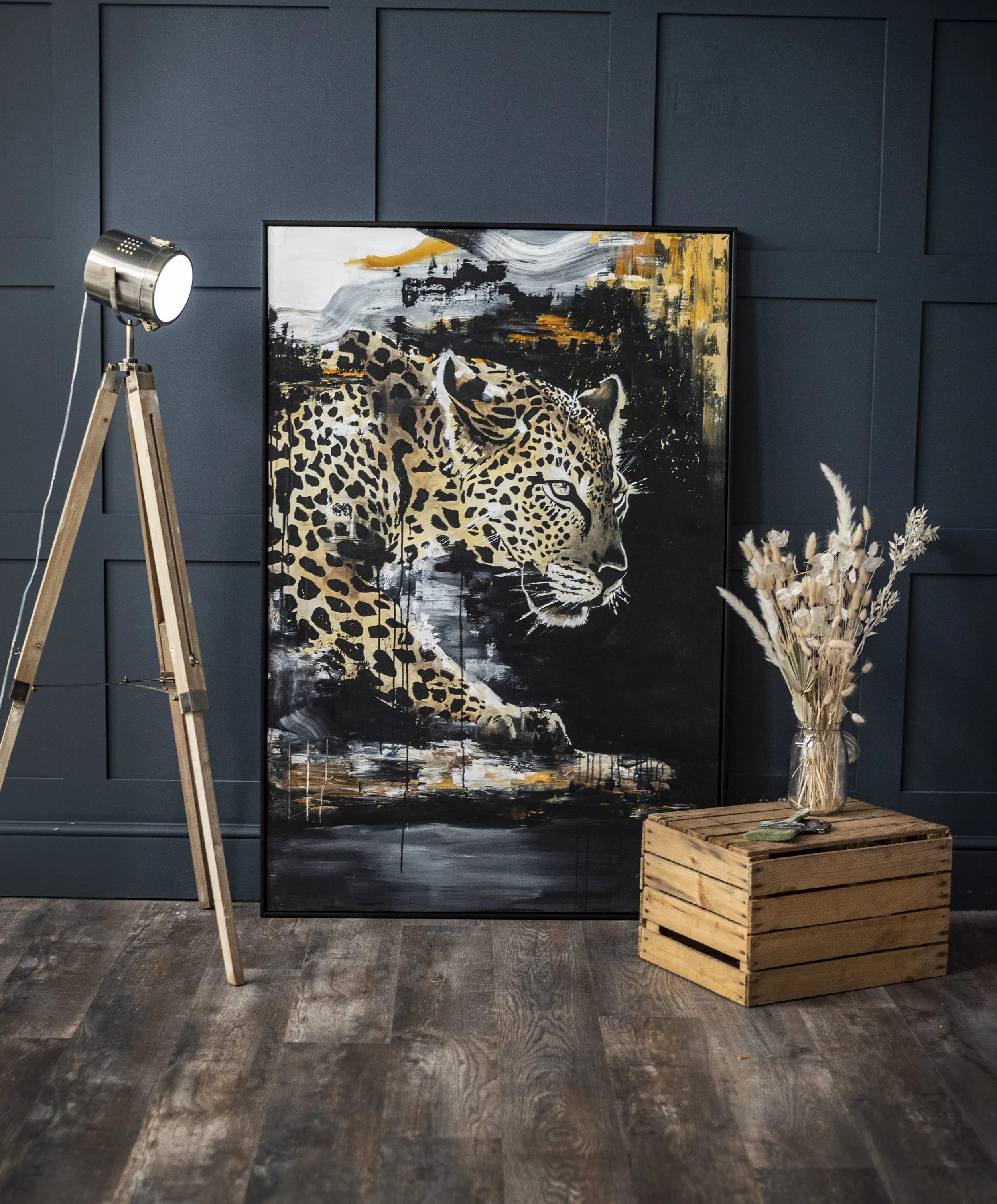 Moonlight Stalker, 100x150cm acrylic on canvas. Framed, black wood.